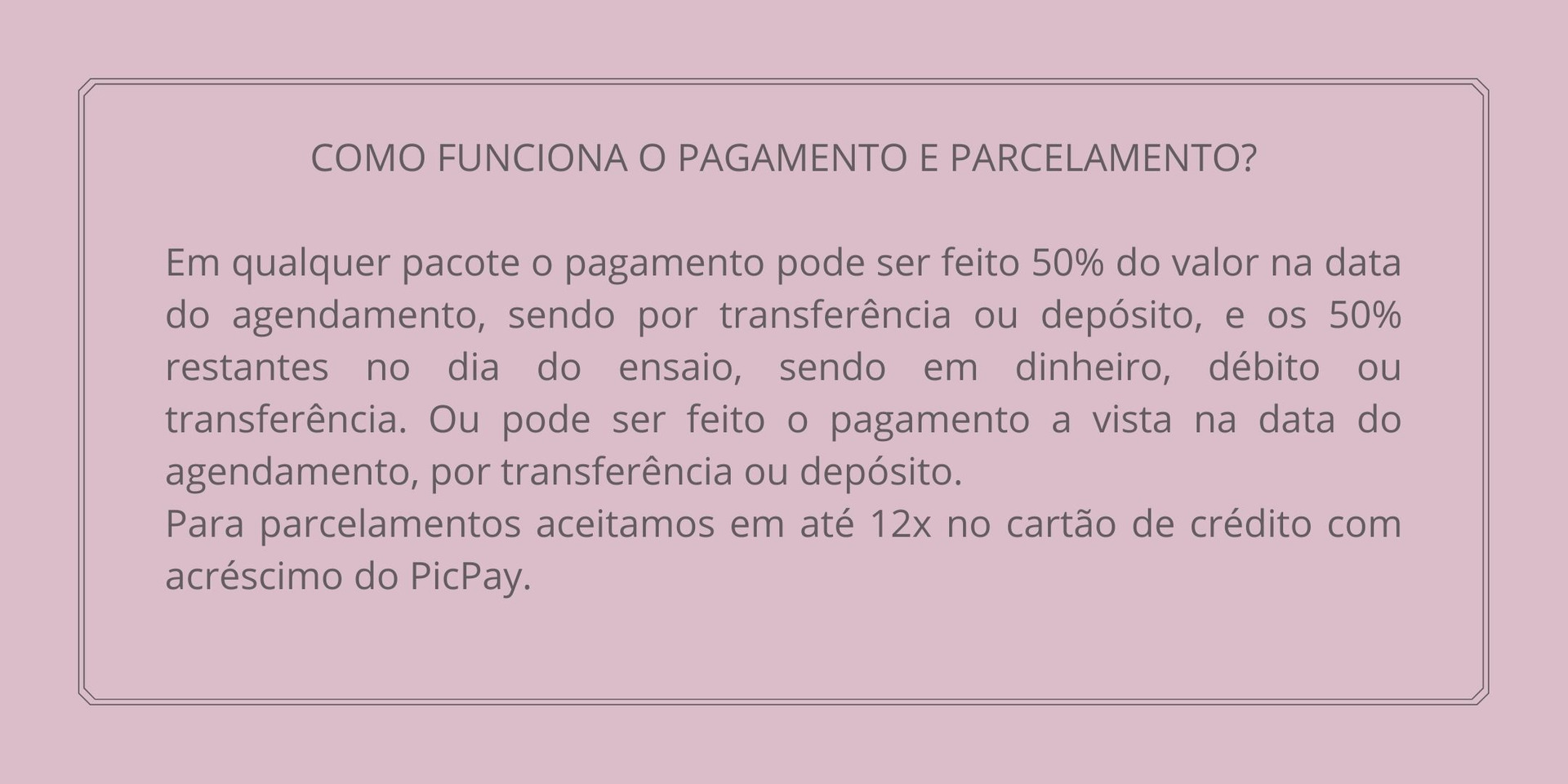 É importante fechar o ensaio com antecedência, para garantir uma vaga no mês desejado. Não será possível fazer a reserva sem o pagamento dos 50% do valor do ensaio.